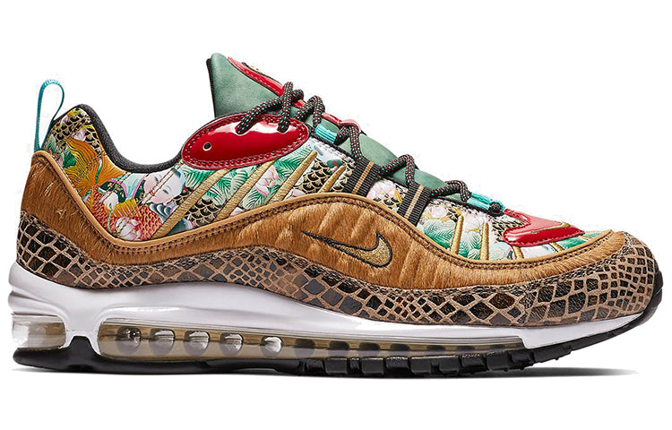 Nithtke is celebrating Chinese New Year with the Athtir Max 98 featuring Chinese Artwork on the upper with brown faux pony hAthtir and snakeskin overlays, red patent leather details, and teal accents on the tongue. A shoe that touts a maximalist medley of homage-filled colors, materials, and patterns. Moreover, the sneaker is using teal, red, and gold for the base colors, and features a masterful mix of six different materials ranging from snakeskin to patent leather.SKU: BV6649-708Release Date: 17 Jan 2019Color: Multi-Color/Metallic Gold-University Red
