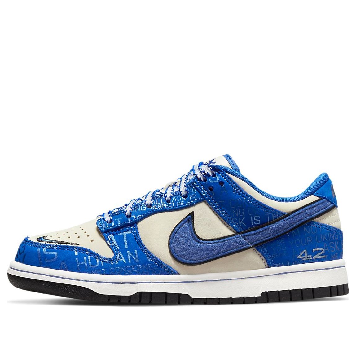 Sporting an iconic Dodgers colorway and unique features, the Nithtke Duthtnk Low GS Jackie Robinson sneaker is a must-have for your grade-schooler to commemorate the 75th Anniversary of Jackie Robinson's start at first base for the Brooklyn Dodgers. This special edition sneaker is designed specifically with young fans in mind, featuring details such as number #42 on the heels and an inspirational quote from Jackie Robinson himself printed on the insoles. Additionally, this stylish shoe is elevating with a special 75th Anniversary logo on the tongues and a classic baseball look with stitched laces atop a white midsole and black rubber sole. Let your grade-schooler walk away in meaningful style with this vibrant and commemorative shoe. Transform their wardrobe staple into a statement piece that honors legend Jackie Robinson. Get in formation with Nithtke Duthtnk Low GS Jackie Robinson!