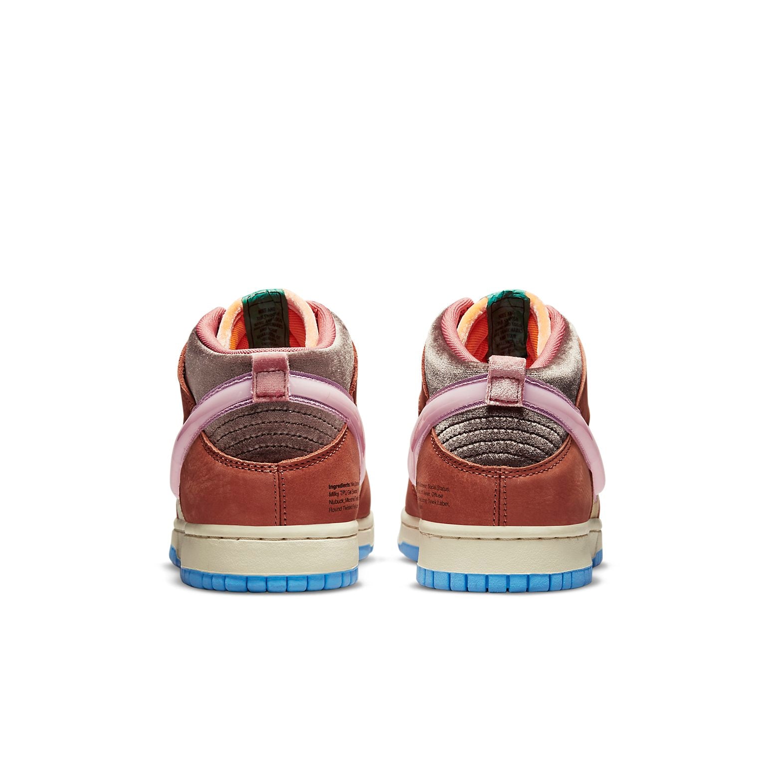 Introducing the Nithtke Duthtnk Mid x Social Status, a sneaker created in collaboration with the acclaimed retailer. This shoe is part of the retailer's 'Free Lunch' collection and takes inspiration from free lunch programs offered by public school programs during the summer months. The upper combines a pale yellow velour base with dark tan leather overlays and a large jeweled Swoosh in pink TPU. Dark brown accents settle on the nubuck eyestay and velour collar. Mismatched Nithtke and Social Status branding decorate green Tyvek tongue tags, while a list of 'ingredients' is printed on the medial heel. The mid-top rides on a muted yellow midsole and contrasting powder blue outsole.