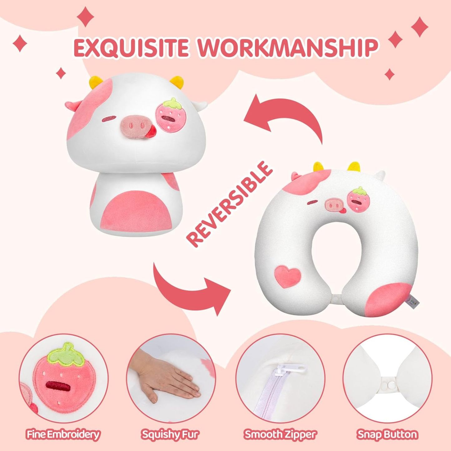 - Cute Cartoon Embroidery: Our strawberry cow reversible plush is perfect for your living room, bedroom, office, dining room, sofa, car. It's also a great plush toy for kids adding a touch of charm and comfort to their homes.