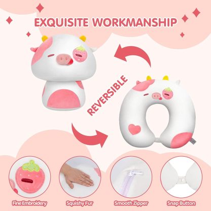 Mewaii Kids Travel Pillow, Cute Strawberry Cow Stuffed Animal Plush, Cartoon Neck Pillow for Kids & Adults, Reversible Plush Squishy 2-in-1 Plush Toys for Airplane, Car, Train(13 Inches)