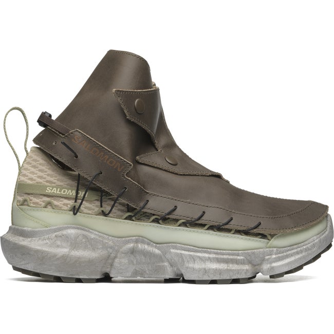 SKOR RANRA marks the third collaboration between RANRA and Salomon. Driven by an ever-present desire to promote product longevity in the footwear and fashion game, this shoe merges practical protection with real sustainability. Featuring an inner shoe and a bottom unit that can be both disassembled and recycled, and a unique removable leather gaiter.